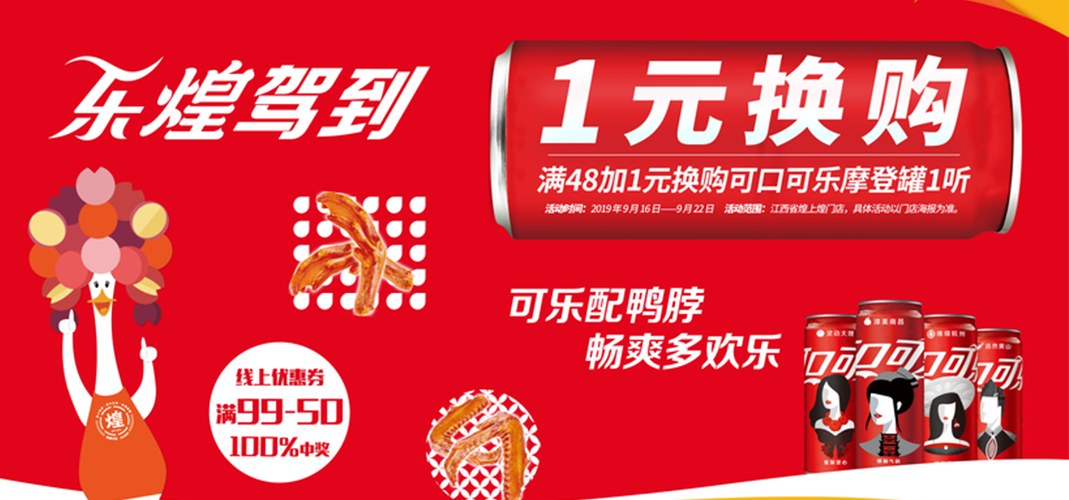 2019年9月16日,煌上煌和著名的飲料品牌可口可樂進(jìn)行了一次為期兩個(gè)月的品牌跨界聯(lián)盟活動(dòng)——“樂煌駕到”。